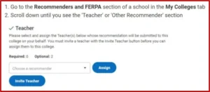 After you are done with the application, you should invite a recommender. Normally, Colleges ask for three recommendations: Two from your teacher and one from a counsellor. After your invitation, your counsellor and teachers come and fill out some details and issue your LOR.